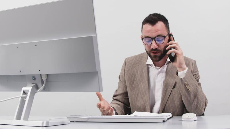 Angry business man talking on phone, looking at computer monitor, stressed frustrated office worker arguing by mobile solving online computer problem with technical support complaining on bad service Pro Video