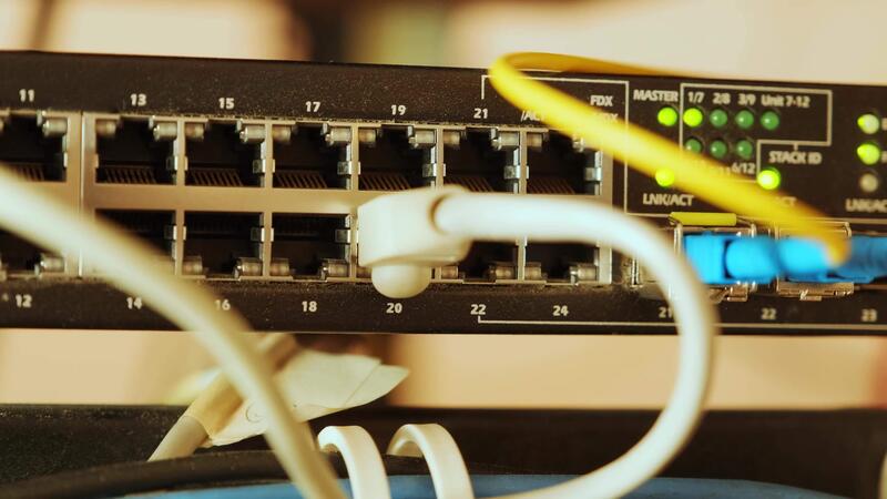Network switch and ethernet cable in rack cabinet. Network connection technology and has a status LED to show working status. Concept of infrastructure with cables connected to data center 3 Pro Video