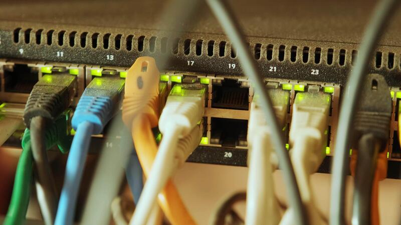 Network switch and ethernet cable in rack cabinet. Network connection technology and has a status LED to show working status. Concept of infrastructure with cables connected to data center 14 Pro Video