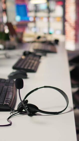 Vertical PC displays in empty call center office where unsatisfied customers call to solve technical problems. Customer support workspace computer monitors on desk used for handling clients complaints Pro Video