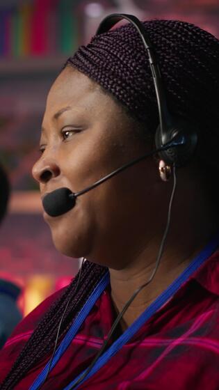 Vertical Smiling call center employee handling customer concerns, doing complaint resolution. Persuasive customer service agent contacts clients to inform them about new products, doing upselling camera A Pro Video