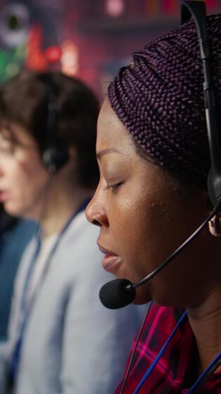 Vertical Employee talking with customer using headphones microphone to identify new sales opportunities. Account manager in office using audio headset, bonding with client to generate leads, camera B close up Pro Video