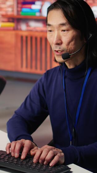 Vertical Joyous technical support senior agent in call center office doing troubleshooting. Jolly experienced Asian IT worker fixing customer connectivity issues using computer, camera B Pro Video