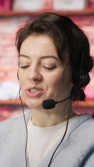Vertical Happy call center employee working on PC, doing account management in office. Cheerful customer support agent handling inbound calls, assisting customers with inquiries, camera A close up Pro Video