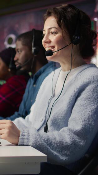 Vertical Friendly call center employee talking in audio headset, assisting customers in office. Happy customer support operator communicating with clients during telephone call, camera B close up Pro Video