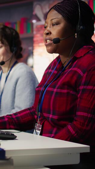 Vertical Customer center employee gesturing loud colleague to quiet down during conversation with client. Call center worker upset by noises in office while talking to customers using headphones mic, camera B Pro Video