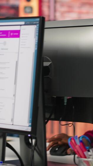Vertical Call center worker tracking shipments at work, looking at computer screen, handling delivery delays. Customer center agent uses software to locate clients packages and provide status updates, camera A Pro Video