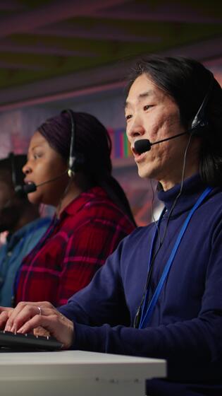 Vertical Call center admin team working together to provide live chat support, handling clients complaints. Teamworking colleagues in office dealing with unsatisfied customers, providing solutions, camera B Pro Video