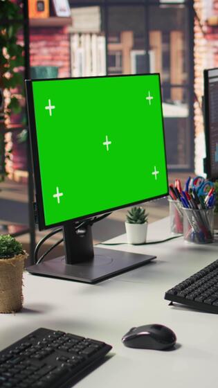 Vertical Green screen mockup computer in office next to displays showing data analytics dashboards. Chroma key isolated screen PC in company workspace next to monitor displaying metrics and data Pro Video