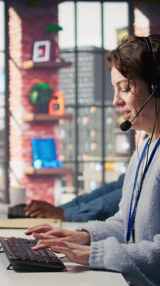 Vertical Joyous call center agent providing step by step guidance to resolve customers concerns. Happy customer center worker diagnosing problems, walking clients through technical solutions, camera B Pro Video