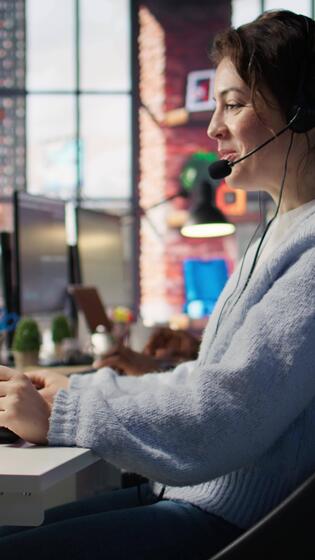 Vertical Happy call center agent in office helping customers by answering questions, solving issues. Smiling woman in customer support workspace in front of PC using headset mic to talk with clients, camera B Pro Video