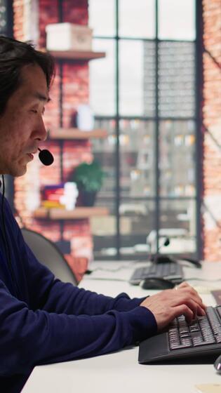 Vertical Senior call center agent helping customers regain access to accounts, resetting passwords. Experienced Asian worker in diverse customer center assisting clients needing help, camera B close up Pro Video