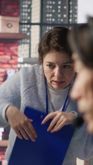 Vertical Team leader overseeing work done by call center agent tracking shipments in office. Customer center manager supervising worker locating clients packages and provide status updates, camera A Pro Video
