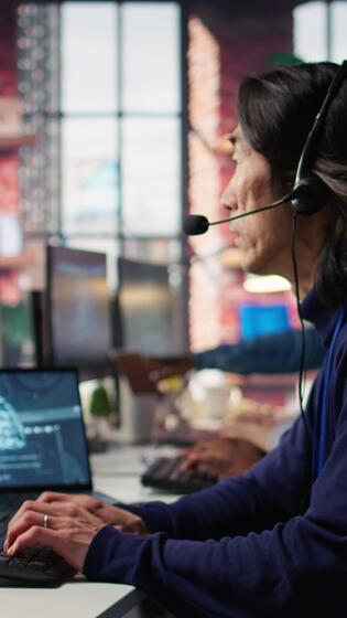 Vertical Customer center employee uses artificial intelligence LLM assistant to locate clients packages. Call center agents track shipments in office, using AI chatbot to generate solutions, camera B Pro Video