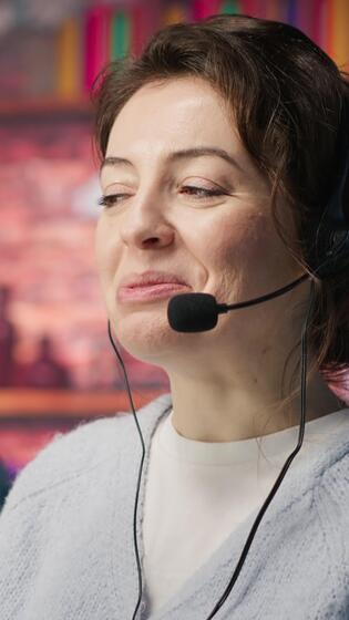 Vertical Friendly call center employee talking in audio headset, assisting customers in office. Happy customer support operator communicating with clients during telephone call, camera A close up Pro Video