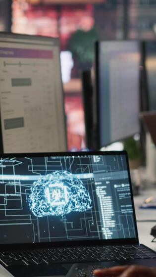 Vertical Call center employee using AI chatbot at office desk to reply to common customer queries, close up. Customer service staff member at work generates automated responses to clients using AI, camera A Pro Video