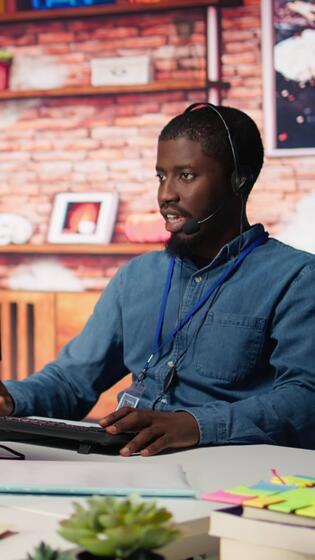 Vertical Call center agents dealing with unsatisfied customers using AI, talking in audio headset. Customer support workers handling clients complaints in company workspace using artificial intelligence Pro Video