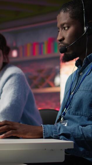 Vertical Manager supervising technical support specialist in call center office doing troubleshooting. Supervisor overseeing work done by IT worker fixing customer connectivity issue, camera B Pro Video