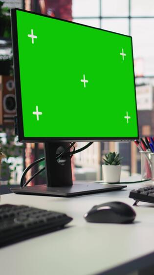 Vertical Isolated screen computer displays in customer support workplace, panning shot. Chroma key PC monitors in empty call center office where unsatisfied customers call to solve technical problems Pro Video