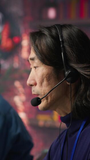 Vertical Call center agent speaking in audio headset microphone, using remote access tools. Worker in customer center assisting clients with installing software, communicating through headphones mic, camera A Pro Video