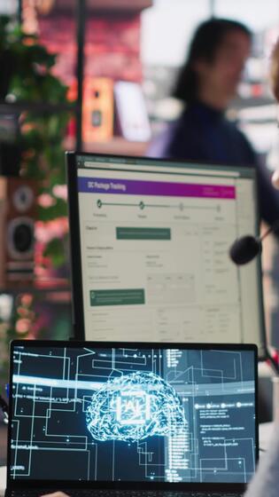 Vertical Worker providing live chat support, typing on keyboard, using AI chatbot to handle clients complaints. Call center agent dealing with unsatisfied customers using artificial intelligence LLM, camera A Pro Video