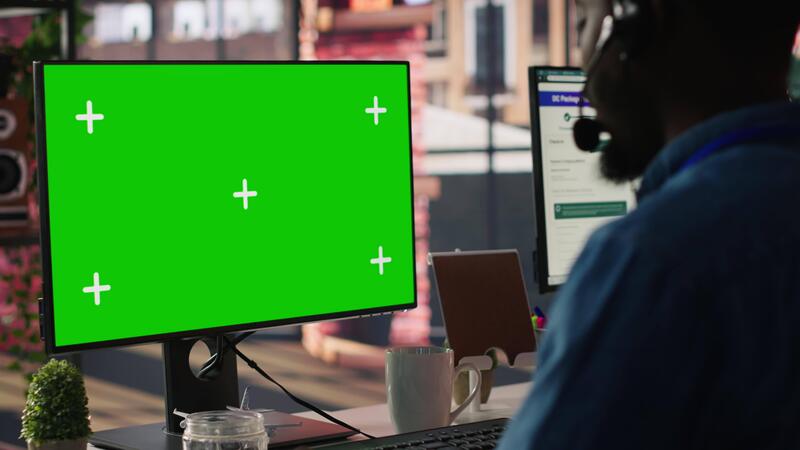Technical support specialist in call center office doing troubleshooting using green screen computer. IT worker fixing customer connectivity issues using chroma key mockup PC, camera A Pro Video
