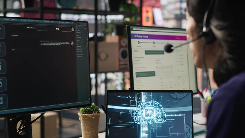 Customer center employee uses artificial intelligence LLM assistant to locate clients packages. Call center agents track shipments in office, using AI chatbot to generate solutions, camera A Pro Video