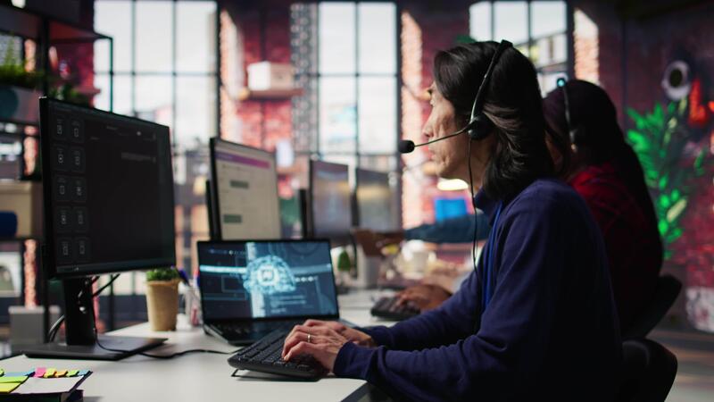 Customer center employee uses artificial intelligence LLM assistant to locate clients packages. Call center agents track shipments in office, using AI chatbot to generate solutions, camera B Pro Video