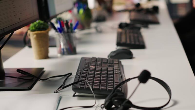CSM system interfaces on computer monitors in empty customer service workplace and call center audio headsets. Customer service management software UI on PC displays and headphones with mic on desk Pro Video