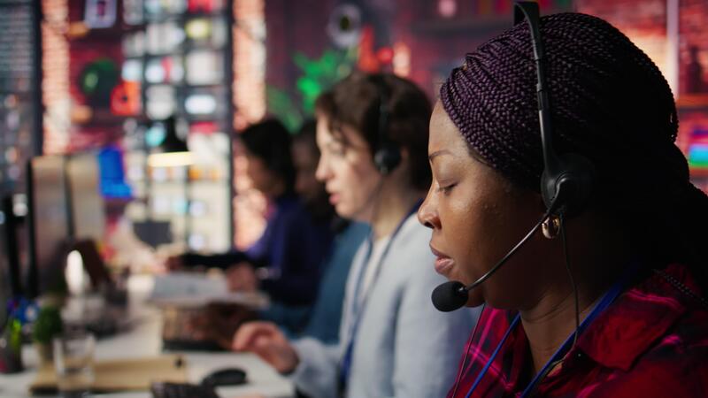 Employee talking with customer using headphones microphone to identify new sales opportunities. Account manager in office using audio headset, bonding with client to generate leads, camera B close up Pro Video
