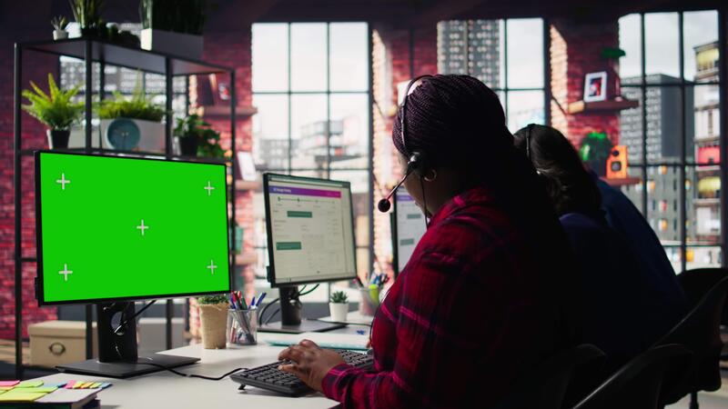 Call center agents tracking shipments in office using green screen computer. Customer center workers use chroma key PC to locate clients packages and provide status updates, camera B Pro Video