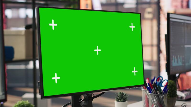 Green screen mockup computer in office next to displays showing data analytics dashboards. Chroma key isolated screen PC in company workspace next to monitor displaying metrics and data Pro Video
