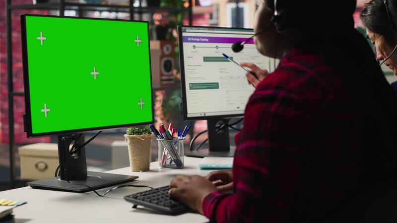 Call center agents tracking shipments in office using green screen computer. Customer center workers use chroma key PC to locate clients packages and provide status updates, camera A Pro Video