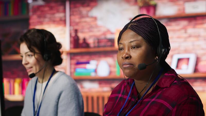 Customer center employee gesturing loud colleague to quiet down during conversation with client. Call center worker upset by noises in office while talking to customers using headphones mic, camera A Pro Video