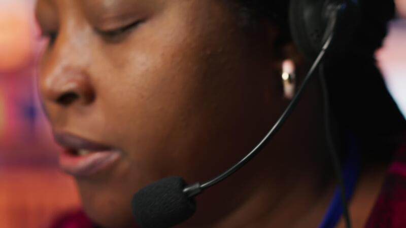 Closeup of employee talking with customer using headphones microphone to identify new sales opportunities. Account manager in office uses audio headset, bonding with client to generate leads, camera A Pro Video