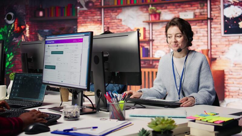 Portrait of smiling call center agent next to coworkers tracking shipments in office, solving tasks. Joyous worker and colleagues in customer center locate clients packages and provide status updates Pro Video