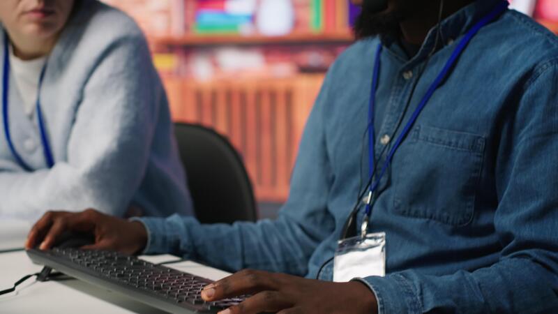 Manager supervising technical support specialist in call center office doing troubleshooting. Supervisor overseeing work done by IT worker fixing customer connectivity issue, camera A Pro Video