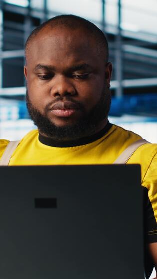 Vertical Smart factory professional implements automated workflows and control systems using laptop, computerizing manual operations. Man integrates sensors into production using notebook, camera A Pro Video