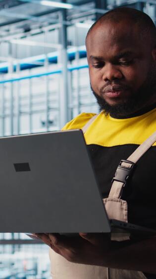 Vertical Industry 4.0 industrial plant engineer automating robotic machines using AI technology. African american man implementing AI features in smart factory using notebook, camera A Pro Video