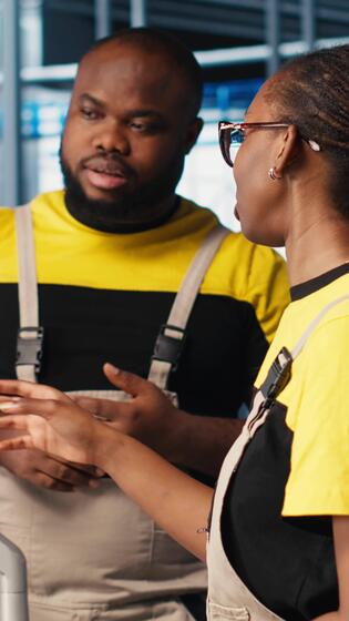 Vertical System administrators in smart factory collecting and analyzing data. Coworkers doing brainstorming, using tracking software in industrial plant equipped with advanced sensors, camera A close up Pro Video