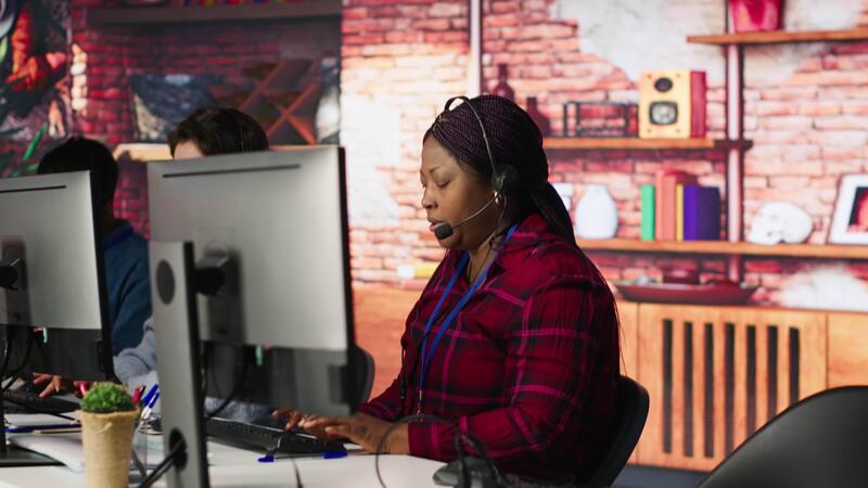 Call center worker arriving at work, using artificial intelligence on laptop to enhance customer interactions. Asian senior agent entering customer service office, using AI technology, camera A Pro Video