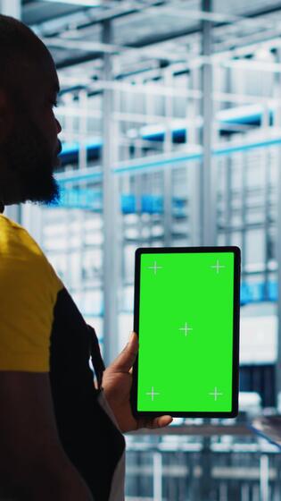 Vertical Worker using green screen laptop in smart factory, collecting and analyzing data. Expert using tracking software on chroma key notebook in industrial plant equipped with advanced sensors, camera A Pro Video