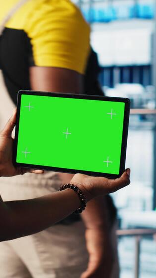 Vertical Smart factory technician manages robotic arms using mockup notebook, close up. Engineer in industry 4.0 industrial plant controls automated machinery using green screen laptop, camera A Pro Video