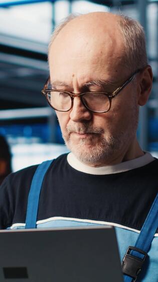 Vertical Smart factory senior engineer uses laptop to oversee operation of robotic arms and conveyor systems. Experienced industry 4.0 plant technician monitors system performance using notebook, camera A Pro Video