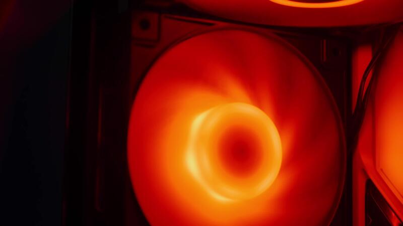 Inside view of a computer with flashing bright red RGB LED backlighting. Gaming computer with warning red light Pro Video