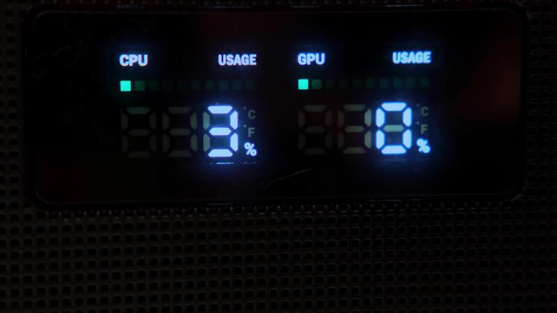 Gaming computer with load indicator. Computer performance and power load panel close-up. Pro Video