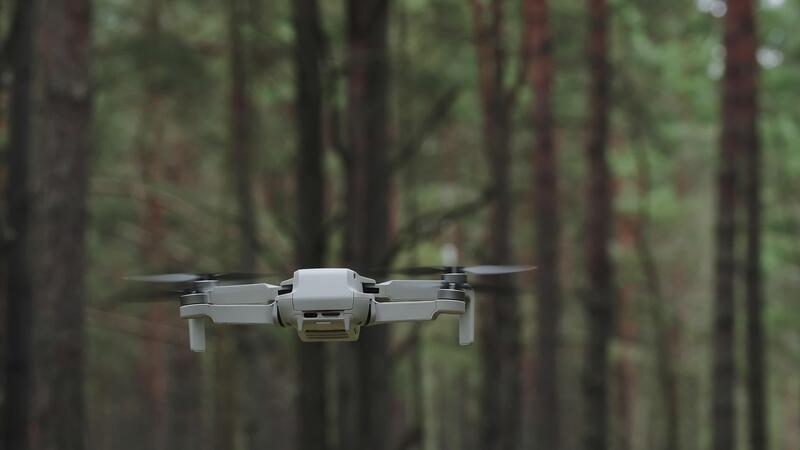 A drone hovering in the air. a drone with a camera flies and takes in the forest. Pro Video