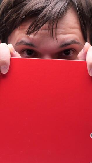 vertical Office worker hiding behind red folder on abstract background Pro Video