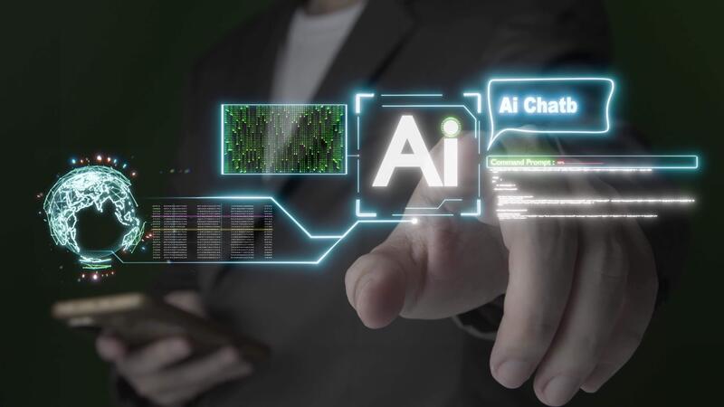 A businessman interacts with a futuristic AI interface, symbolizing artificial intelligence, machine learning, and digital transformation in modern technology. Pro Video
