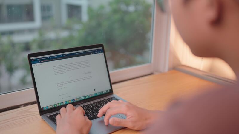 Laptop Focus A close-up shot of a person hands typing on a laptop keyboard, the screen displaying text. The laptop sits on a wooden table, with a window and a blurred cityscape in the background. Pro Video